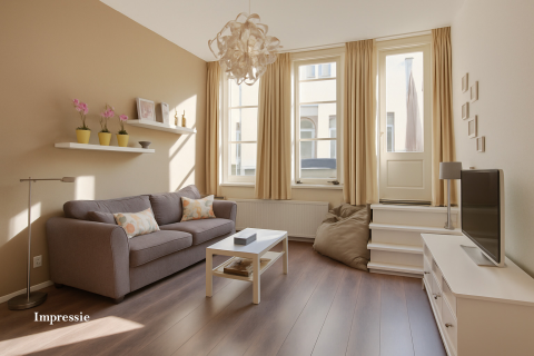 Via enkele treden omhoog vanuit de gang is de prachtige woonkamer bereikbaar. Wat een licht! Aan de voorzijde een mooie erker met glas-in-lood bovenlichten, en vaste bank met weids zicht over het plantsoen en de singel. Aan de achterzijde openslaande deuren naar het tweede, zonnige dakterras met uitzicht op de Vrouwetoren. De woonkamer is licht afgewerkt, heeft een hoog, glad gestuukt plafond met ornament, een kastenwand met mooie, ingebouwde 19e eeuwse hout met gietijzeren schouw met open haard. Trapkast met boiler. Aansluitend deur naar de keuken/pantry aan de voorzijde. Deze is voorzien van een rvs spoelbak, kunststof aanrechtblad en diverse kasten. Raam met zicht op de singel.
